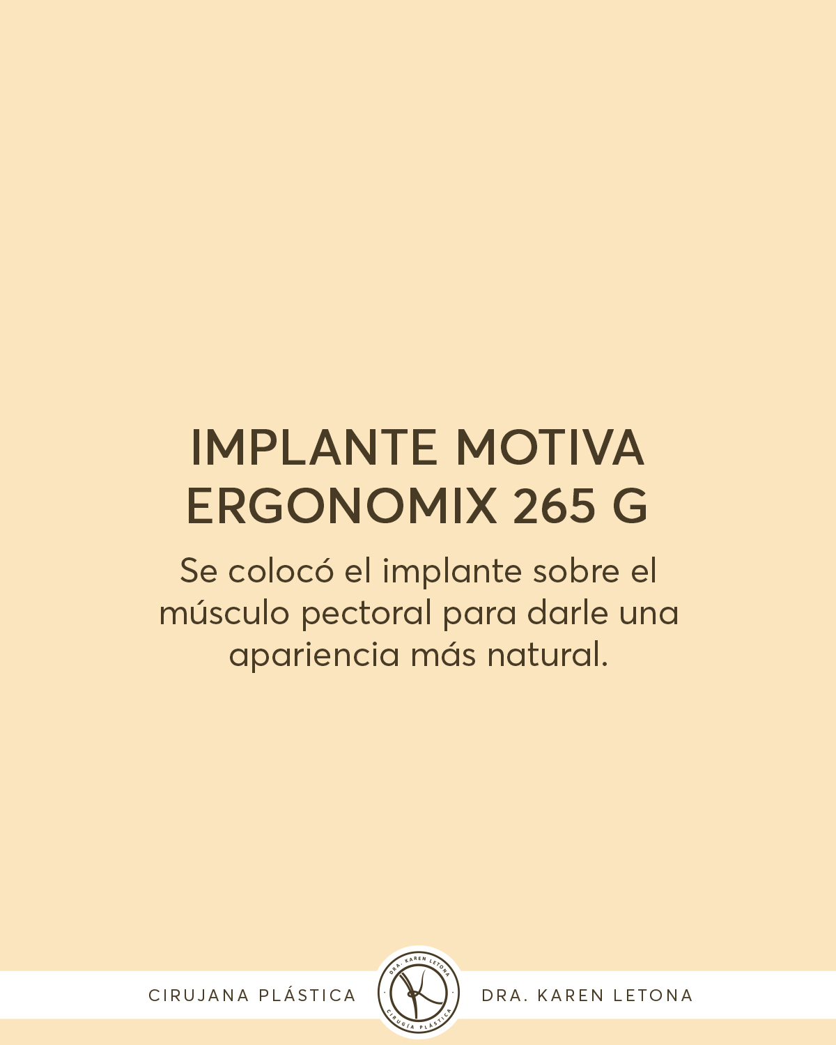 Utilizo implantes mamarios para poder aumentar la copa del brassier. Ahora existen implantes mamarios 100% llenos de gel de silicón la tecnología ha mejorado con los años, el riesgo de ruptura es menor del 1%.